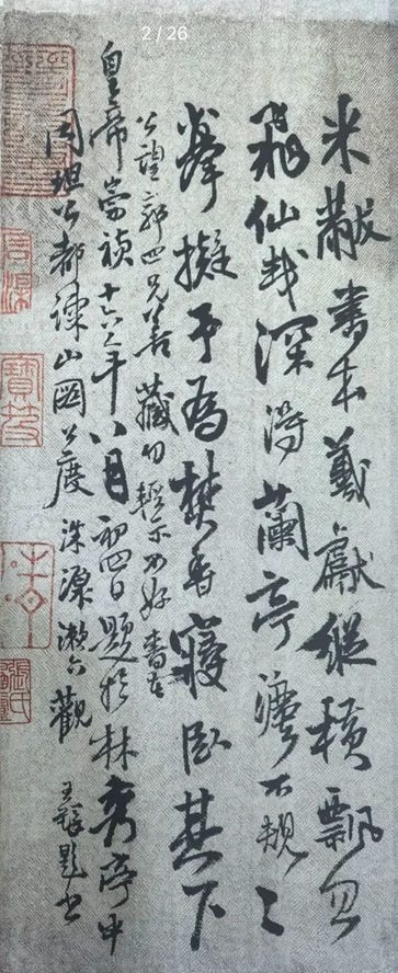 So although this inscription takes Mi Fu’s poem as its point of departure, its real temperament is unmistakably Wang Duo’s own. It is not speaking on Mi Fu’s behalf. It uses Mi Fu as an entrance, then drives hard into its own structural taste and formal personality.